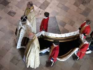 Il re e la regina hanno preso posto sulla Gold State Coach, antica carrozza dorata costruita nel 1762 e usata in tutte le incoronazioni britanniche dal 1831 in avanti. Dietro di loro una seconda carrozza con a bordo l’erede al trono William, principe di Galles, la sua consorte Kate e i tre figli.