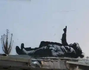 Il chiaroscuro netto, quasi teatrale, accentua la distanza tra le due presenze e amplifica il senso di esclusione che permea la scena. Come spesso accade nel lavoro di Banksy, l’immagine non offre soluzioni ma apre una ferita visiva: lo sguardo dello spettatore è costretto a interrogarsi sul destino di quel corpo a terra e sul significato di quel dito che indica qualcosa — o qualcuno — che resta fuori campo.